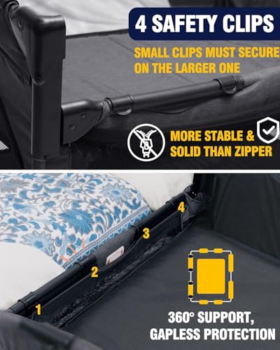 ❸ PLAYPEN MODE & 360° VENTILATION:Easily convert BEKA bassinet bedside sleeper into a playpen by removing the upper layer and placing the mattress at the base. The 360° mesh design provides optimal ventilation and visibility, letting parents monitor their baby effortlessly while keeping pets out. A side zipper allows your child to crawl in and out, making playtime fun and cleanup simple. BEKA pack n play with bassinet adds additional storage for toys and essentials, adapting seamlessly to your child’s growth.