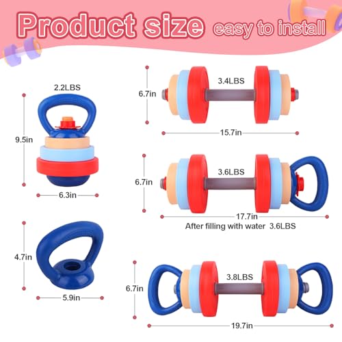 🎯 ADJUSTABLE & CUSTOMIZABLE WEIGHTS – Dumbbells and kettlebell can be filled with water or sand (not included) to increase resistance as kids grow stronger, making this set long-lasting and adaptable for ages 3-6.