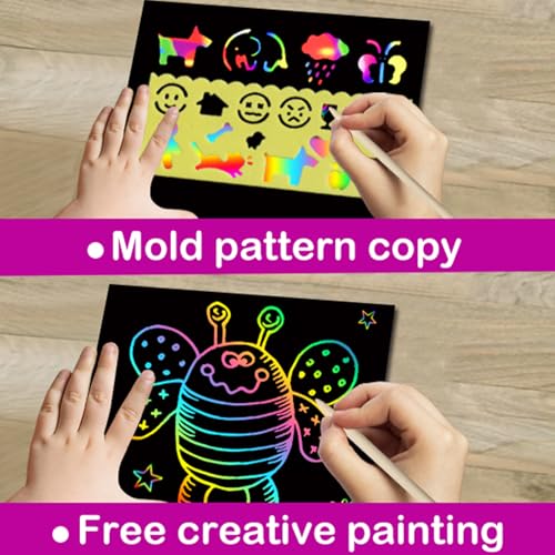 SO EASY TO PLAY: Simply scrape the black scratch picture surface with stylus and a rainbow of colors will appear. You can free creative painting on the scratch page art, or use templates to draw various patterns on the blank scratch pad art