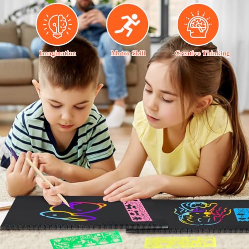 Scratch Paper Art Set for Kids:Combo set includes 2 pack books(size: 10.3 x7.7 inch,10 sheets for one pcs) of scratch paper arts, 4 pcs drawing styluses and 4 pcs Stencils. Create unique scratch art with this premium, affordable, and plentiful scratch art paper pad kit.