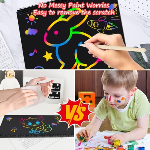 Super Safe & Quality: Our magic scratch off notebook is made of No odd flavor,no toxic,no paint,premium thick papers that isn’t harmful for your kids. The wooden styluses of scratch paper art is made of environmentally friendly nature wood.