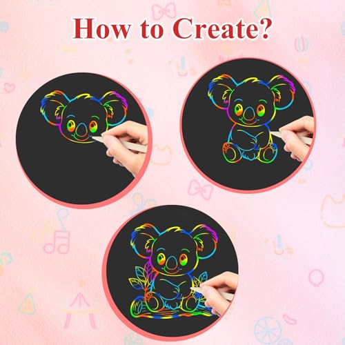 Easy to Use & Create: This scratch art book is No need to paint, just a stylus scratch off the black surface to reveal the colors underneath and then painting few lines to create more colorful pictures what your child imagine or want to stay, Good art supplies for your toddlers to practice drawing and make some simlpe gift card or bookmark.