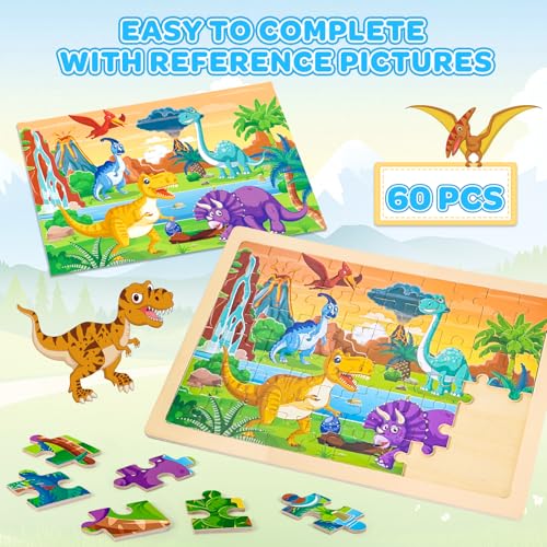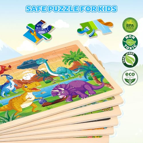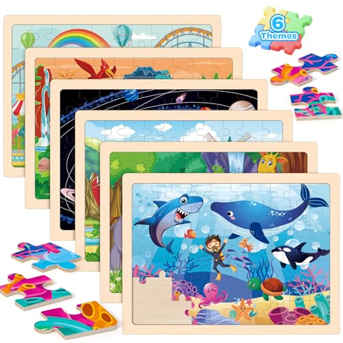 6 Theme Toddler Puzzles – 6 pack 60pcs wooden jigsaw puzzles for kids ages 3-5 years old. The wooden toys include amusement park, dinosaurs, space, farm, animals, and ocean puzzles. Easy, funny, wonderful- educational Shape Puzzles toys develop hand-eye coordination, fine motor skills, and creative thinking